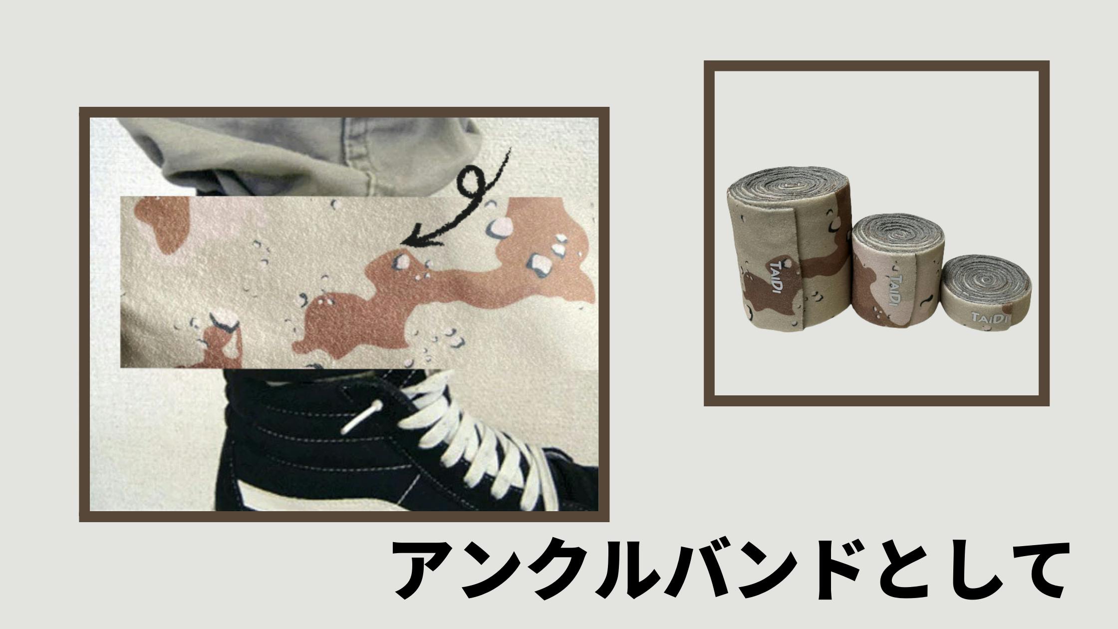 フリースのように柔らかい素材の為、体に巻き付けるバンドとしての使い方にも適しているのが「TAIDI」 特徴です。
